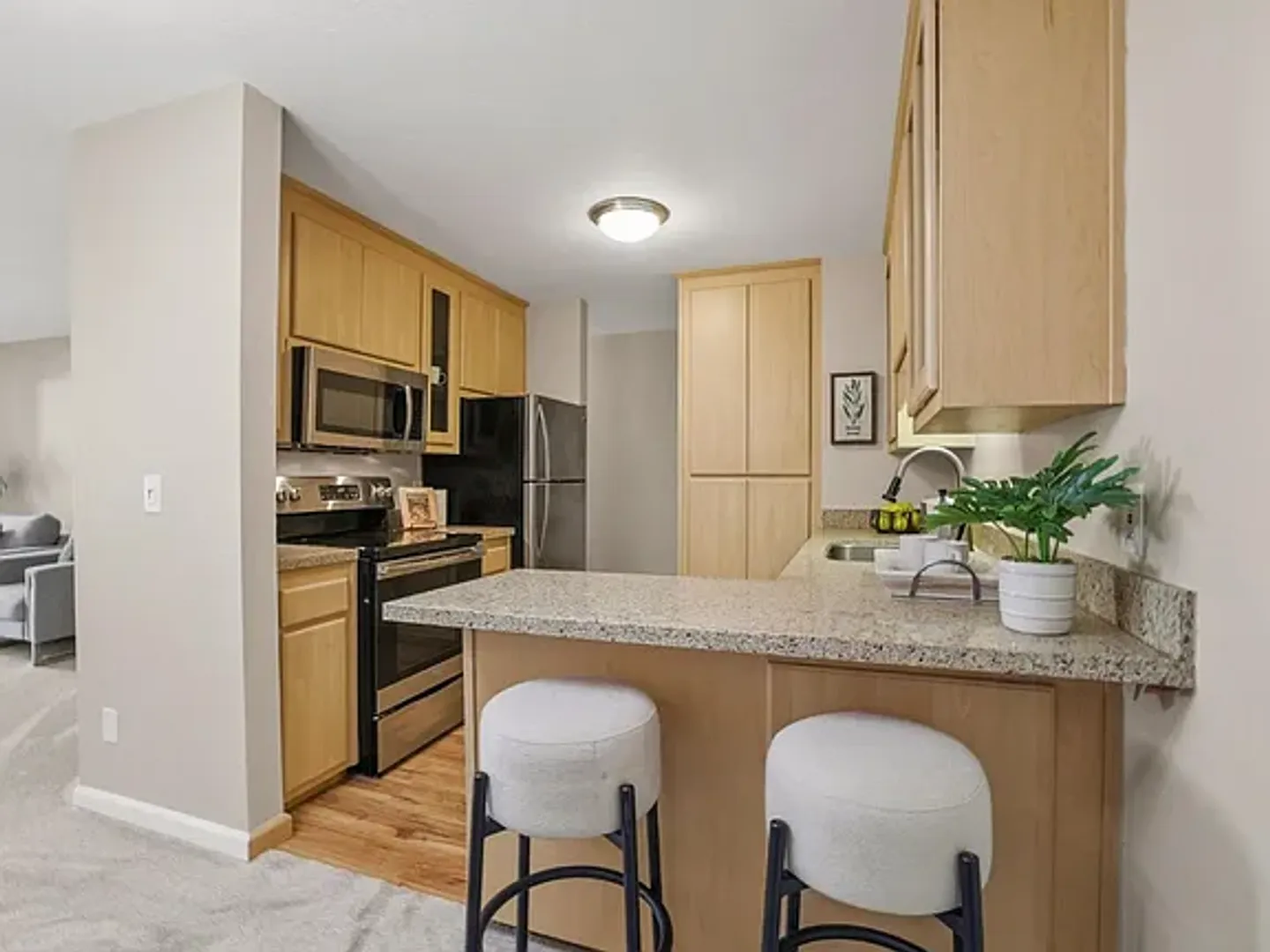 The interior has been recently updated with new carpet, vinyl, and paint. The kitchen features newer cabinets, granite countertops with a breakfast bar, and stainless-steel appliances, including a refrigerator, electric range, and a brand-new dishwasher. The unit also offers an oversized living room with significant natural light, a private balcony, and a bedroom and bathroom featuring a quartz-topped vanity. Property is unfurnished.