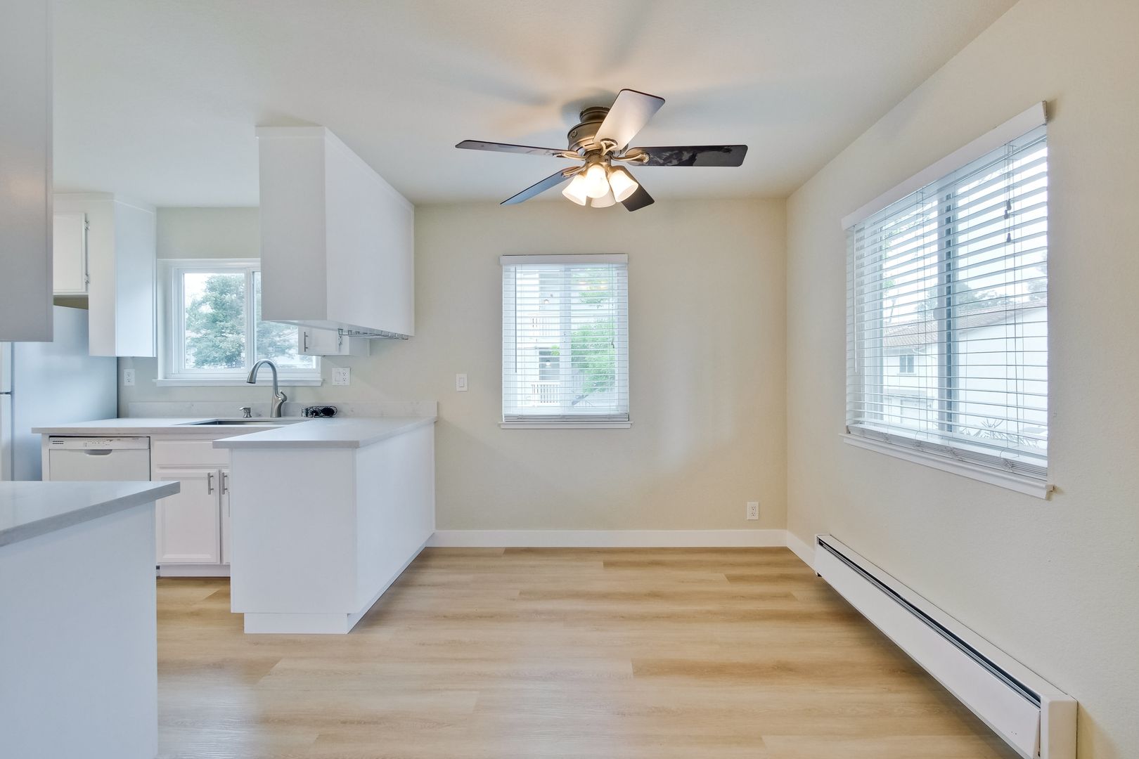 LED recessed lighting in main living area with ceiling fan in dining room and in-wall a/c unit & baseboard heating.