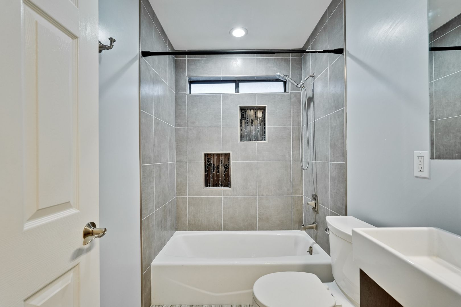Bathroom has been recently updated with new vanity new tile and new flooring.